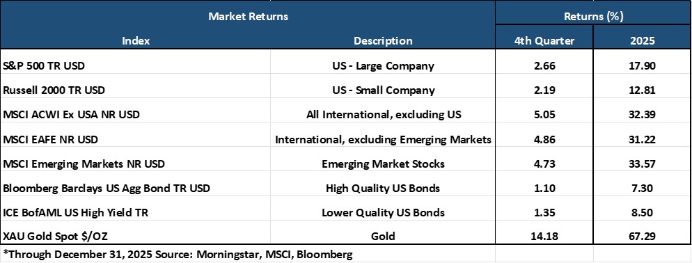 2025 proved to be a historically strong year for markets despite headlines including April's tariff announcements, a government shutdown, the ongoing influence of artificial intelligence, the passage of the One Big Beautiful Bill Act, and geopolitical tensions. Despite these challenges, the fourth quarter concluded a positive year in which: