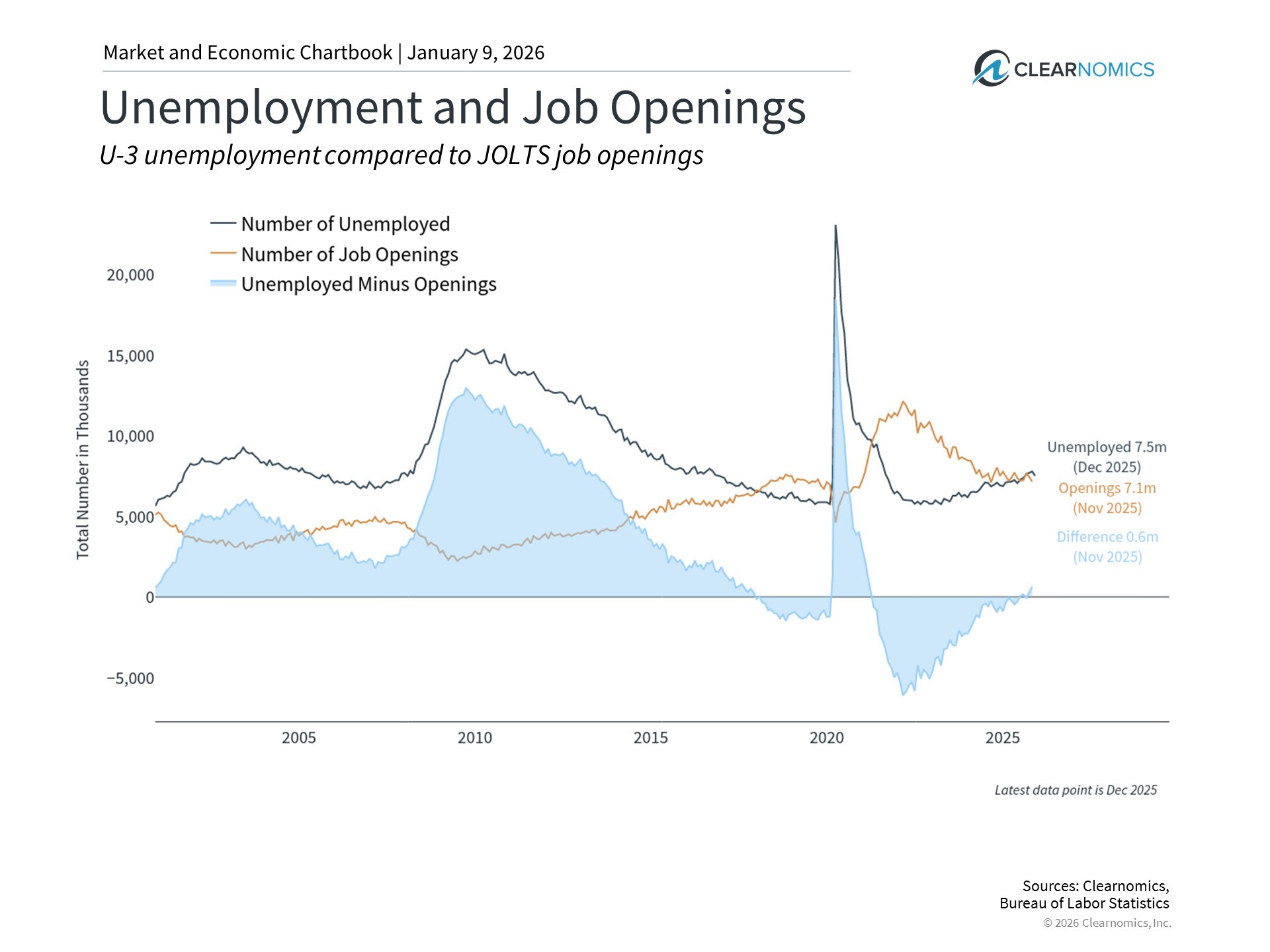 JOBS: The December employment report showed only 50,000 jobs added, with the unemployment rate dropping modestly to 4.4%. Overall, job creation slowed significantly in 2025, with just 584,000 jobs added compared to 2.0 million in 2024. There were three months of negative job growth, the most since 2020. This means the average monthly job growth was only 49,000, well below the 2024 average of 168,000. The average monthly change over the fourth quarter of 2025 was a loss of 22,000 jobs. A separate report showed that job openings have declined to 7.1 million (see chart). This indicates there are now fewer job openings than unemployed people, reversing the trend of recent years. It suggests companies may be hiring fewer people amid economic uncertainty.