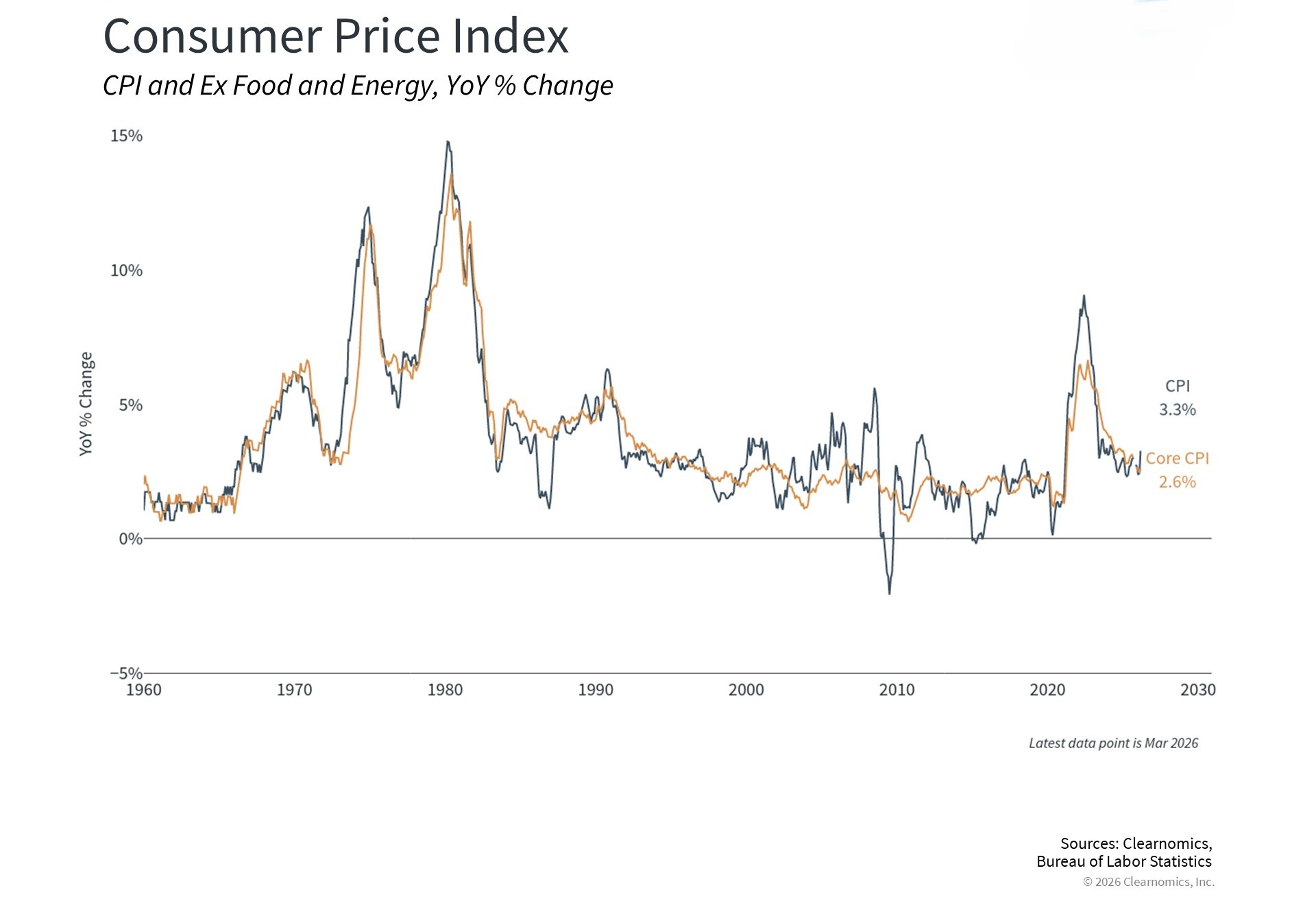 INFLATION: For March 2026, the Consumer Price Index for All Urban Consumers (CPI-U) increased by 0.9% on a seasonally adjusted basis from the prior month. Over the past 12 months, inflation has risen by 3.3%, almost a full percentage point increase from February’s annual pace. The core CPI (all items excluding food and energy) grew 0.2% in March from February and was up 2.6% year-over-year, up slightly from February and still exceeding the Fed’s target. The energy component of the index jumped 12.5 percent year-over-year, a couple of percentage points higher than analysts had been expecting.